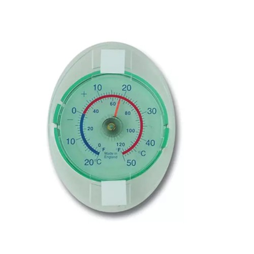 A clever thermometer which allows outdoor temperature to be read from inside. It mounts directly onto glass to show the temperature on a red and blue, easy to read scale.