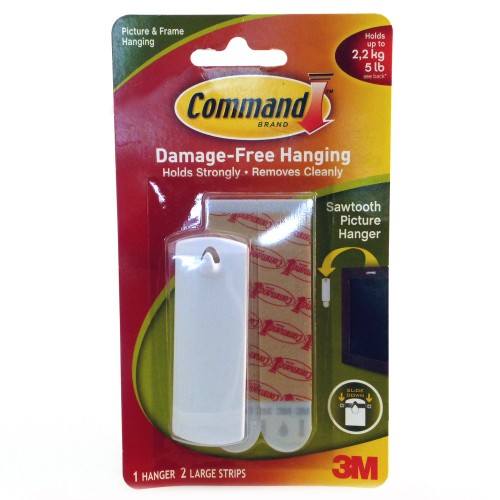Command™ Picture Hangers, Hooks and Clips make decorating quick and easy. Command™ Sawtooth Picture Hangers are designed for sawtooth, D-ring and keyhole hanging frames. Contains 1 hanger, 2 large strips. Holds up to 1.8lbs.