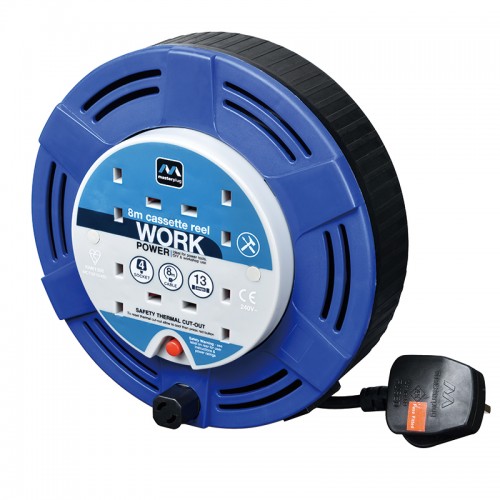 This practical small cassette reel in blue is perfect for all short extension jobs, with five metres of cable and four sockets. The cable is protected by the outer plastic casing which enables convenient and safe storage. This easy to use and practical design has an easy hold rear grip, ideal for domestic use or DIY.